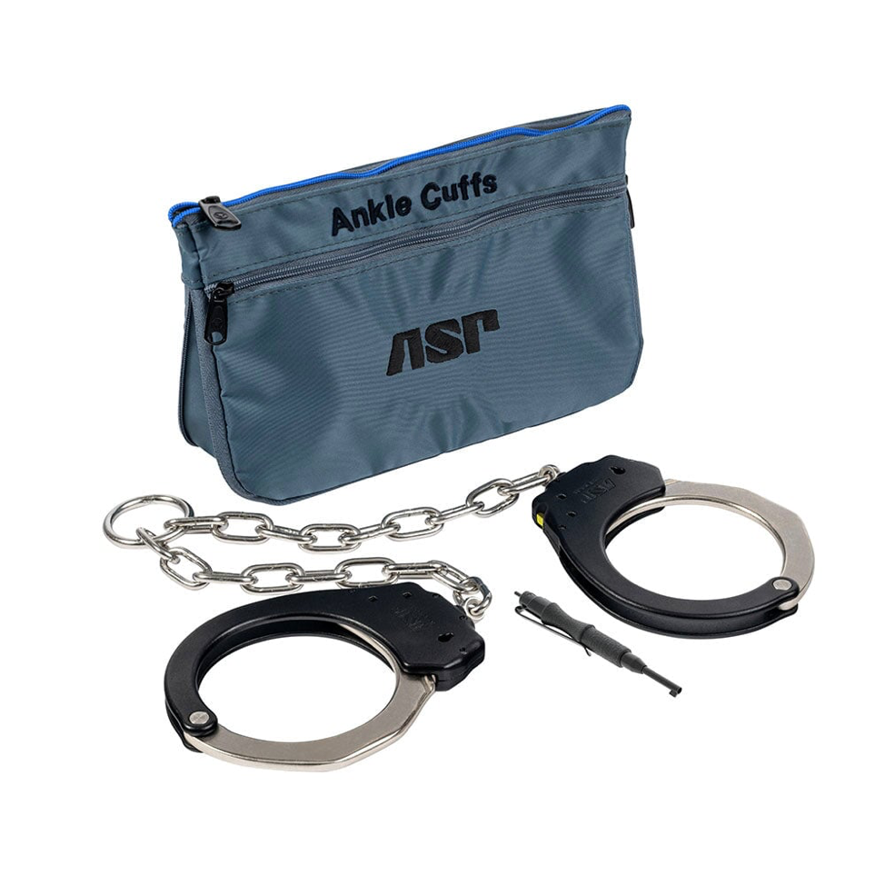 ASP Ankle Plus Cuffs incorporate the innovative design and construction features that revolutionized the restraint industry. Forged aluminum bodies, forged flat contact bows, replaceable Lock Sets, double sided key way, two sided double locks, one direction single double lock release, matte black type III hardcoat anodizing, stainless steel swivels and chain and spiral pin construction set ASP Ankle cuffs apart from all other available leg restraints.