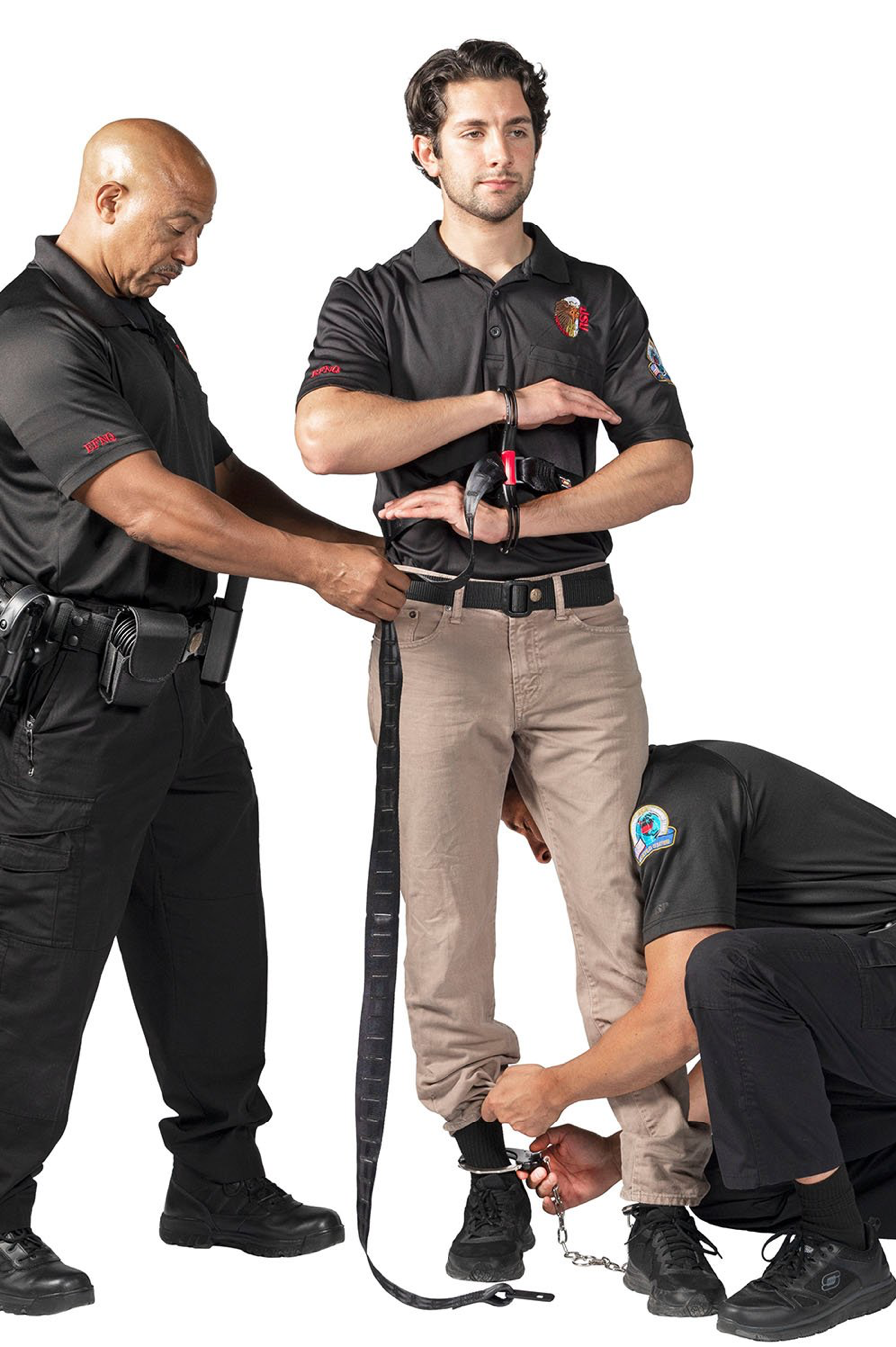 The exclusive, efficient design of our original Transport Kit allows the handcuffs to remain safely in place while the transport system is applied, adjusted or removed to prepare a subject for transport, booking or court. The Transport Plus kit adds another level of security and control, with the incorporation of leg shackles.
