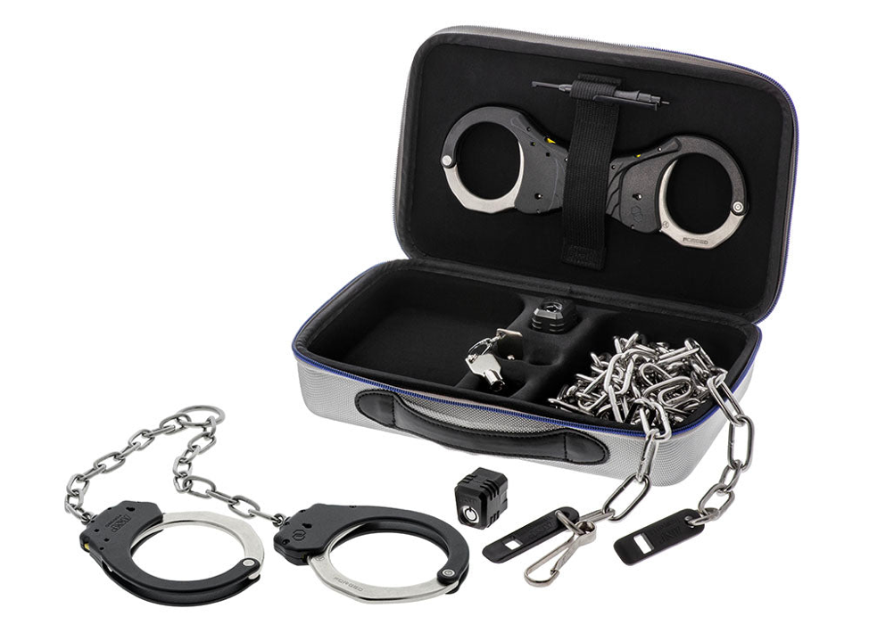 This complete kit includes our revolutionary Rigid Plus Cuff wrist restraints, an extended handcuff key, a set of ankle Plus Cuffs, extra-long chain, two auto-engaging restraint system locks, two cylinder keys, and a custom-designed EVA-molded carrying case.